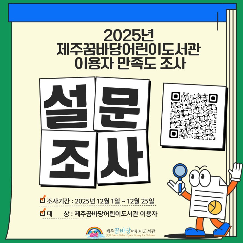 | 제목 | 2025년 제주꿈바당어린이도서관 이용자 만족도 조사 안내 | ||