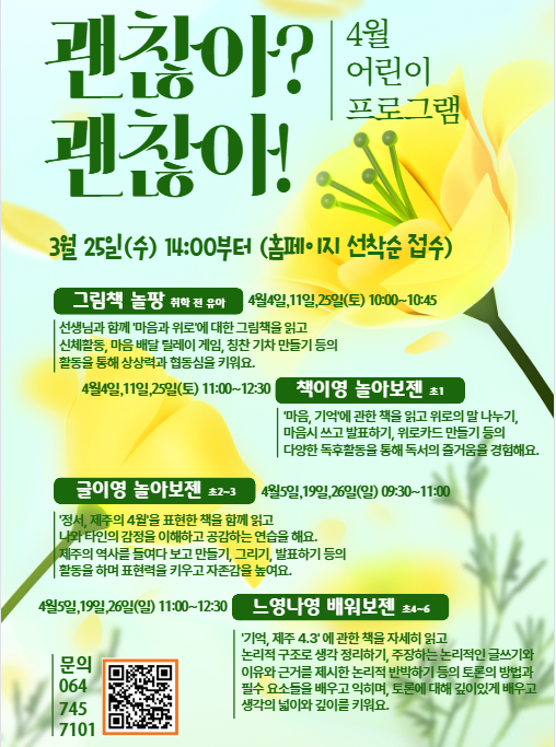 4월은 <마음, 기억과 위로>를 테마로 [괜찮아? 괜찮아!]를 주제어로 선정하여 아래와 같은 프로그램을 준비하였습니다. 접수는 3월 25일(수) 14:00부터 <홈페이지-전체 프로그램>에서 선착순 접수합니다. 4월에 따뜻한 마음으로 만나요. 문의 064) 745-7101