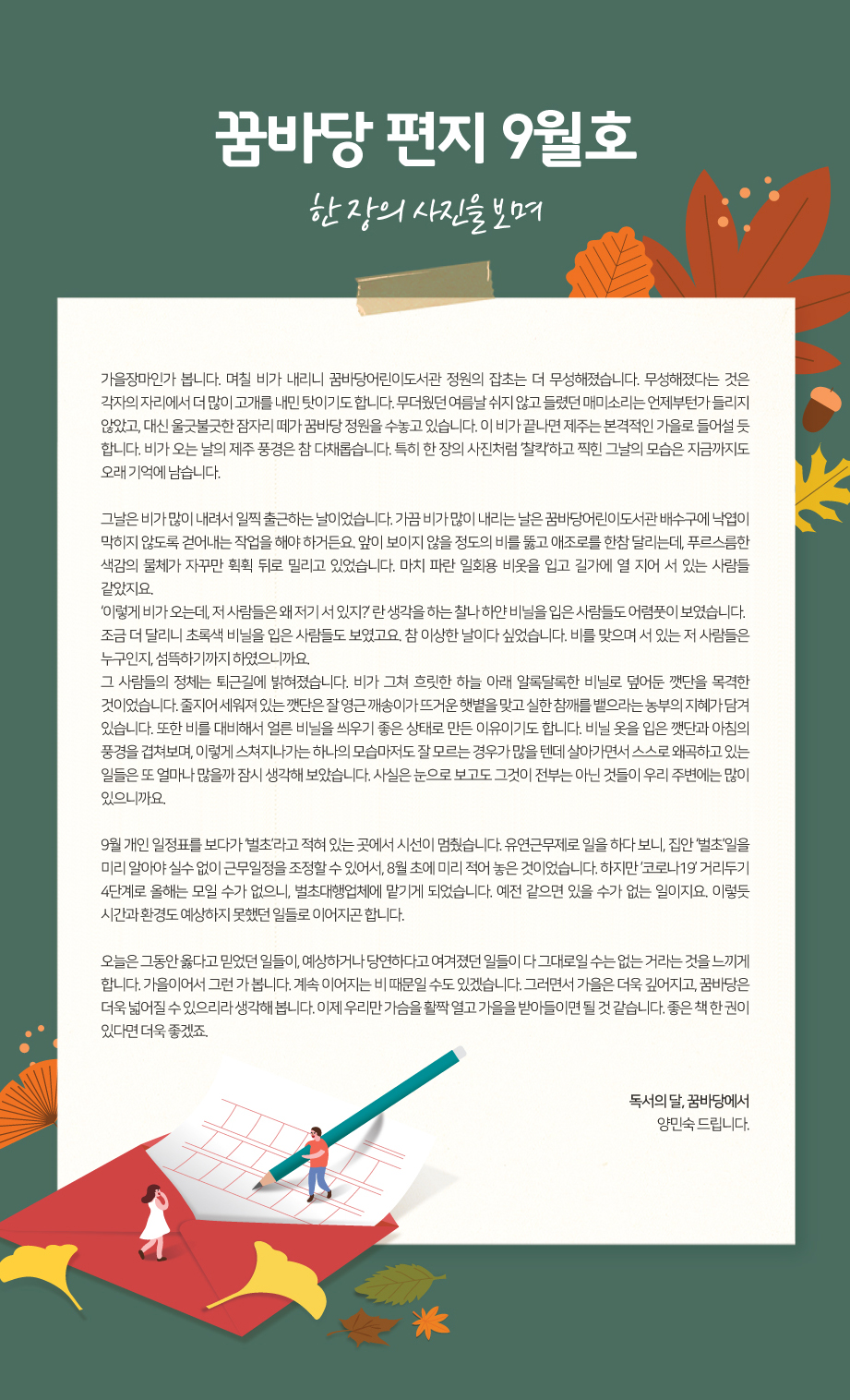 | 19 | 2021년 9월 꿈바당 편지 0 | 제주꿈바당어린이도서관 | 2021-10-01 | 3,003 |