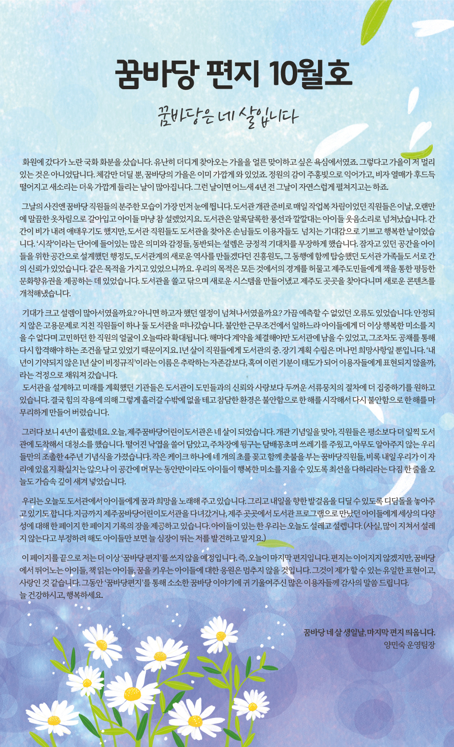 | 20 | 2021년 10월 꿈바당 편지 0 | 제주꿈바당어린이도서관 | 2021-10-28 | 2,829 |