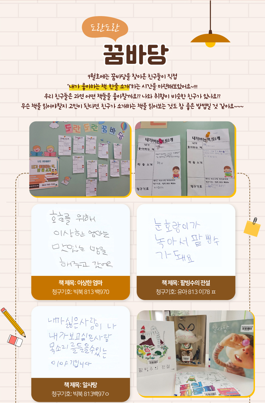 | 33 | 2023년 10월 도란도란꿈바당 0 | 제주꿈바당어린이도서관 | 2023-10-27 | 1,750 |