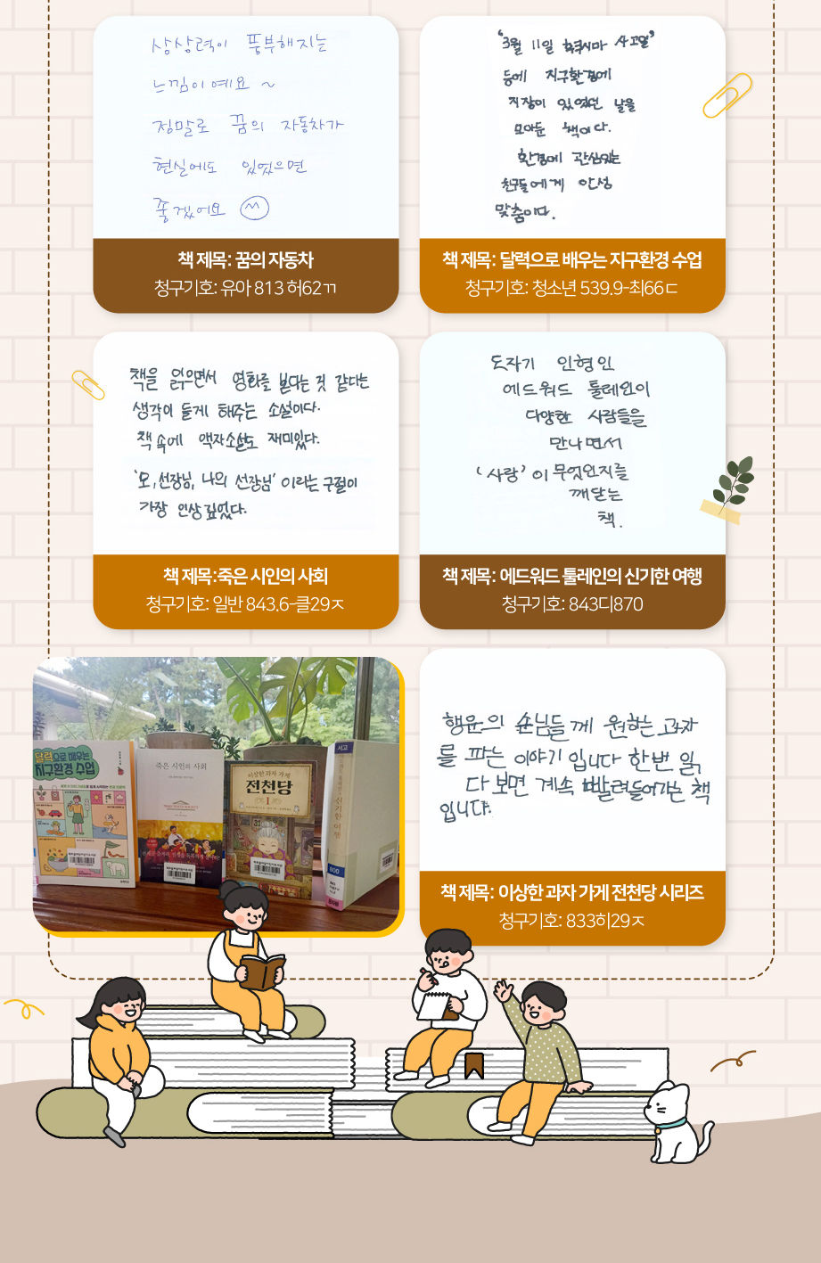 | 32 | 2023년 8월 도란도란꿈바당 0 | 제주꿈바당어린이도서관 | 2023-08-25 | 1,915 |