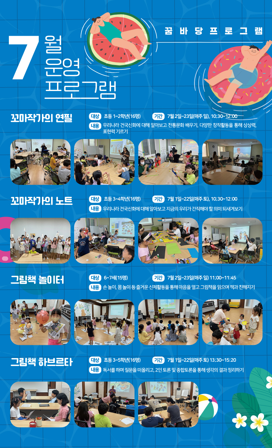 | 27 | 2022년 7월 꿈바당프로그램 0 | 제주꿈바당어린이도서관 | 2022-07-14 | 2,528 |