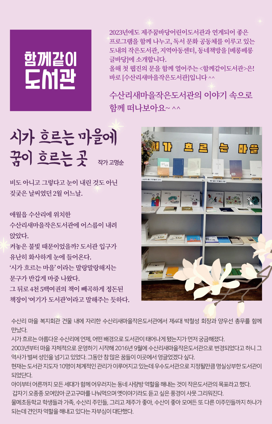 | 33 | 2023년 2월 함께같이 도서관 0 | 제주꿈바당어린이도서관 | 2023-03-02 | 2,270 |