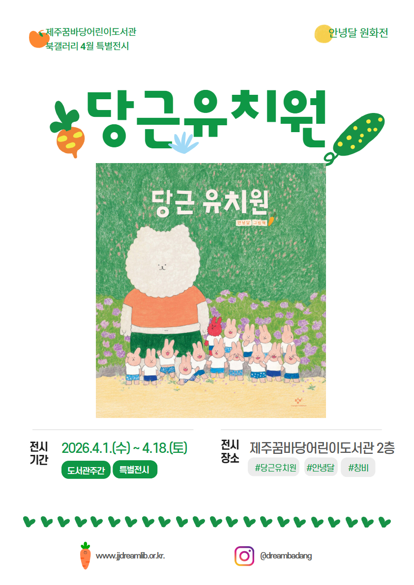 전시기간 : 2026. 4. 1. (수) ~ 4. 18.(토) 전시장소 : 제주꿈바당어린이도서관 2층 복도 도서관 주간을 맞이하여 안녕달 작가의 '당근유치원' 아트프린팅이 전시되어 있습니다. 감사합니다.