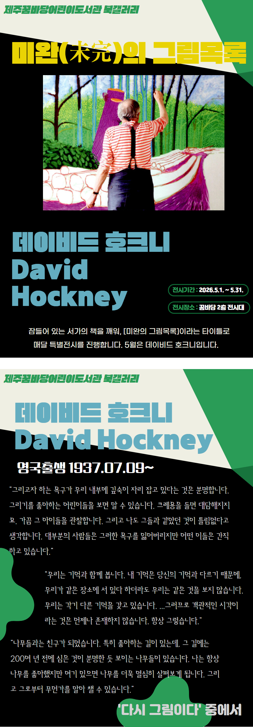 전시기간 : 2026. 5. 2.(토) ~ 5. 31.(일) 5월 특별전시 [미완의 그림목록] 작가는 5월의 초록을 떠올리게 하는 데이비드 호크니입니다.