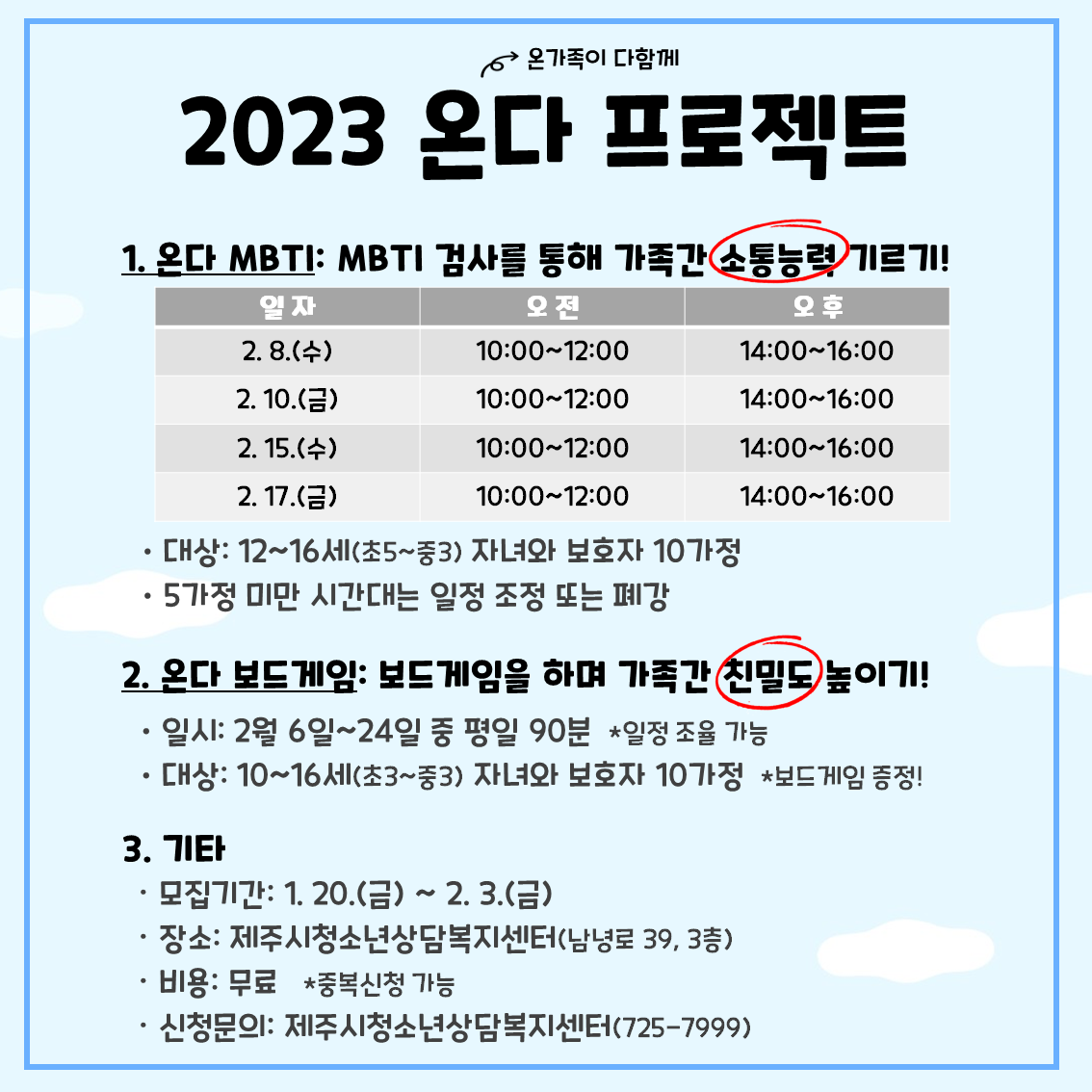 3. 기타 1) 모집기간: 1. 20.(금)~2. 3.(금) 2) 장소: 제주시청소년상담복지센터(남녕로 39, 3층) 3) 비용: 무료 *중복신청 가능 4) 신청문의: 제주시청소년상담복지센터(725-7999) |