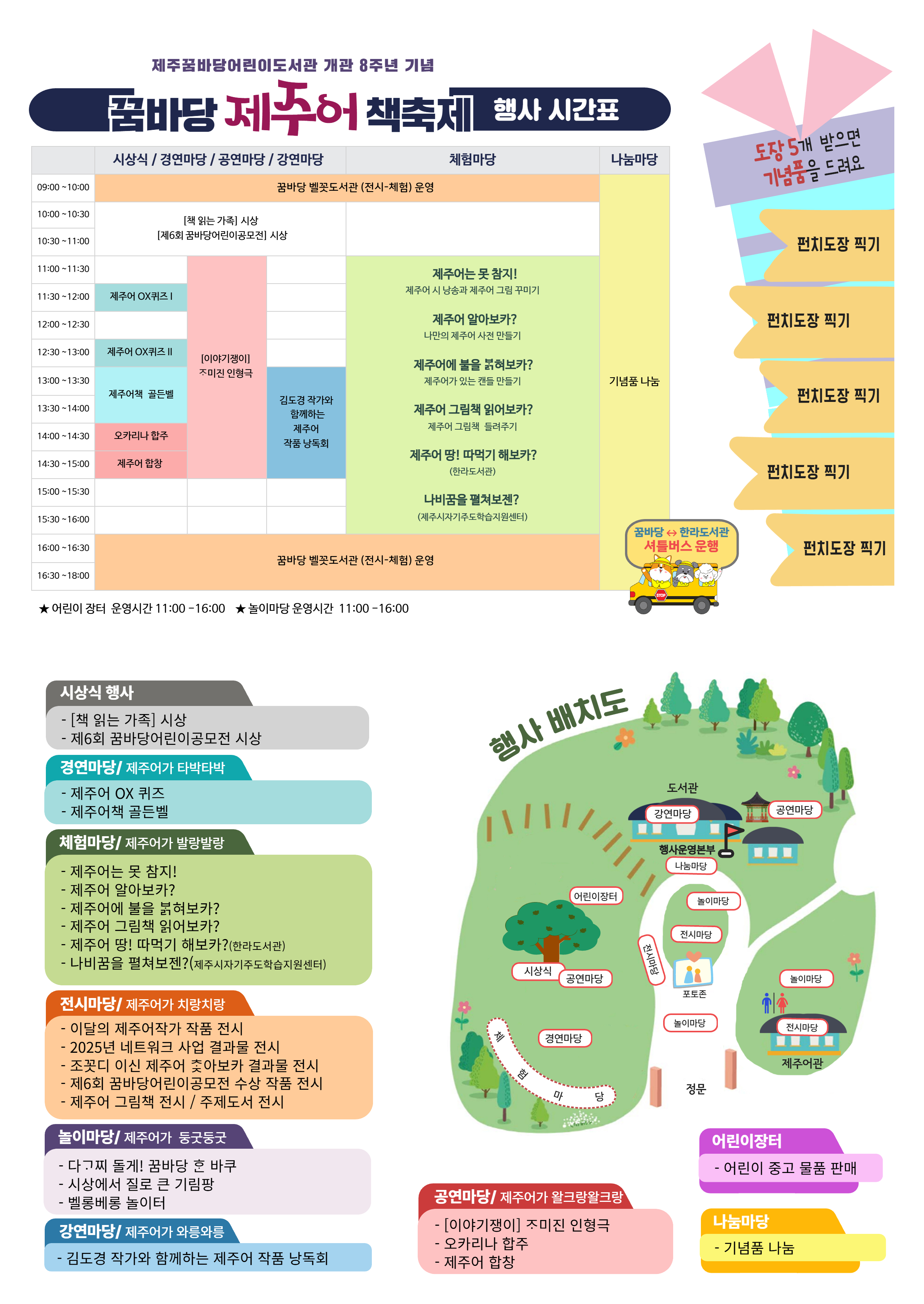 [2025꿈바당 제주어 책축제] 운영 안내(2025년 10월 25일) 1. 시상식 : <책 읽는 가족>상 시상, 제6회 꿈바당어린이공모전 시상 2. 전시마당: 네트워크 사업, 조꼿디 이신 제주어, 공모전 수상작품 등 3. 강연마당: 김도경작가와 함께하는 제주어 낭독회 4. 체험마당: 6개의 제주어 관련 부스 운영 5. 어린이장터 6. 놀이마당: 다 같이 놀게, 꿈바당 한 바퀴, 시상에서 질로 큰 기림팡 7. 경연마당: 제주어 OX퀴즈, 제주어책 골든벨 8. 공연마당: 제주어 노래, 오카리나 연주, 이야기쟁이 인형극 공연 미션을 완수하면 예쁜 기념품도 받을 수 있습니다. 10월 25일은 제주꿈바당어린이도서관으로 오세요.^^ |