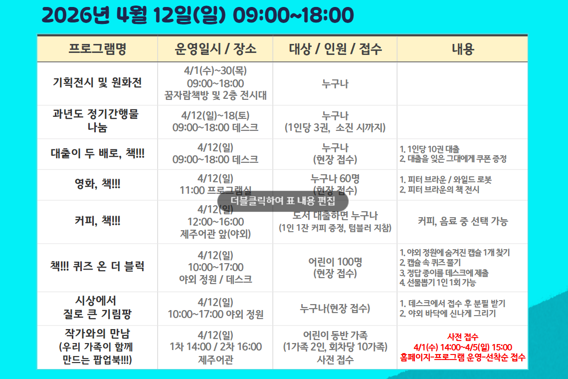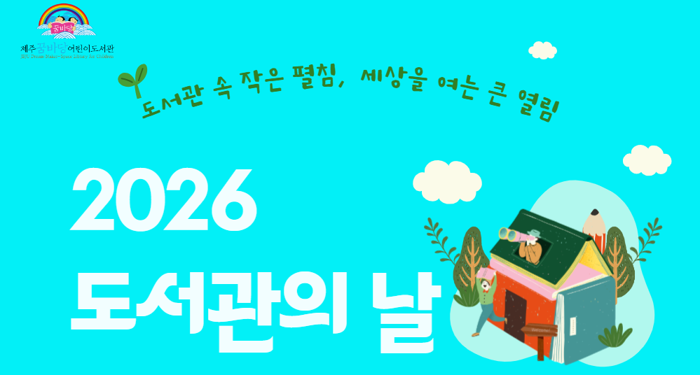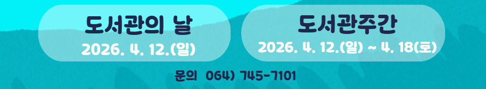 제62회 도서관주간 및 2026 도서관의날을 맞이하여 어린이와 가족을 위한 행사를 아래와 같이 마련하였습니다. 많은 관심과 참여 부탁드립니다. 문의)064-745-7101