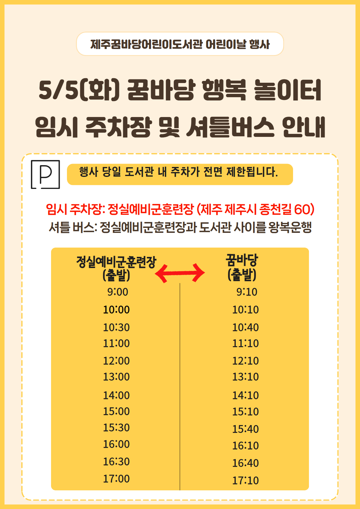 | 제목 | [주차안내] 5/5(화) 꿈바당 행복놀이터 행사 임시 주차장 및 셔틀버스 안내 | ||