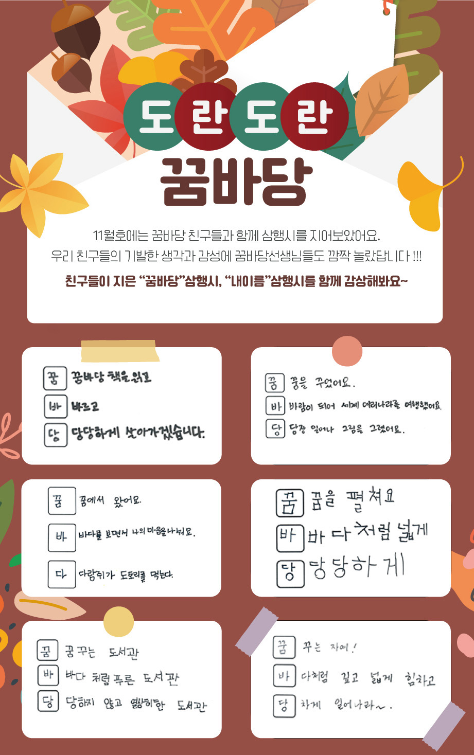 | 33 | 2023년 10월 도란도란꿈바당 0 | 제주꿈바당어린이도서관 | 2023-10-27 | 1,674 |
