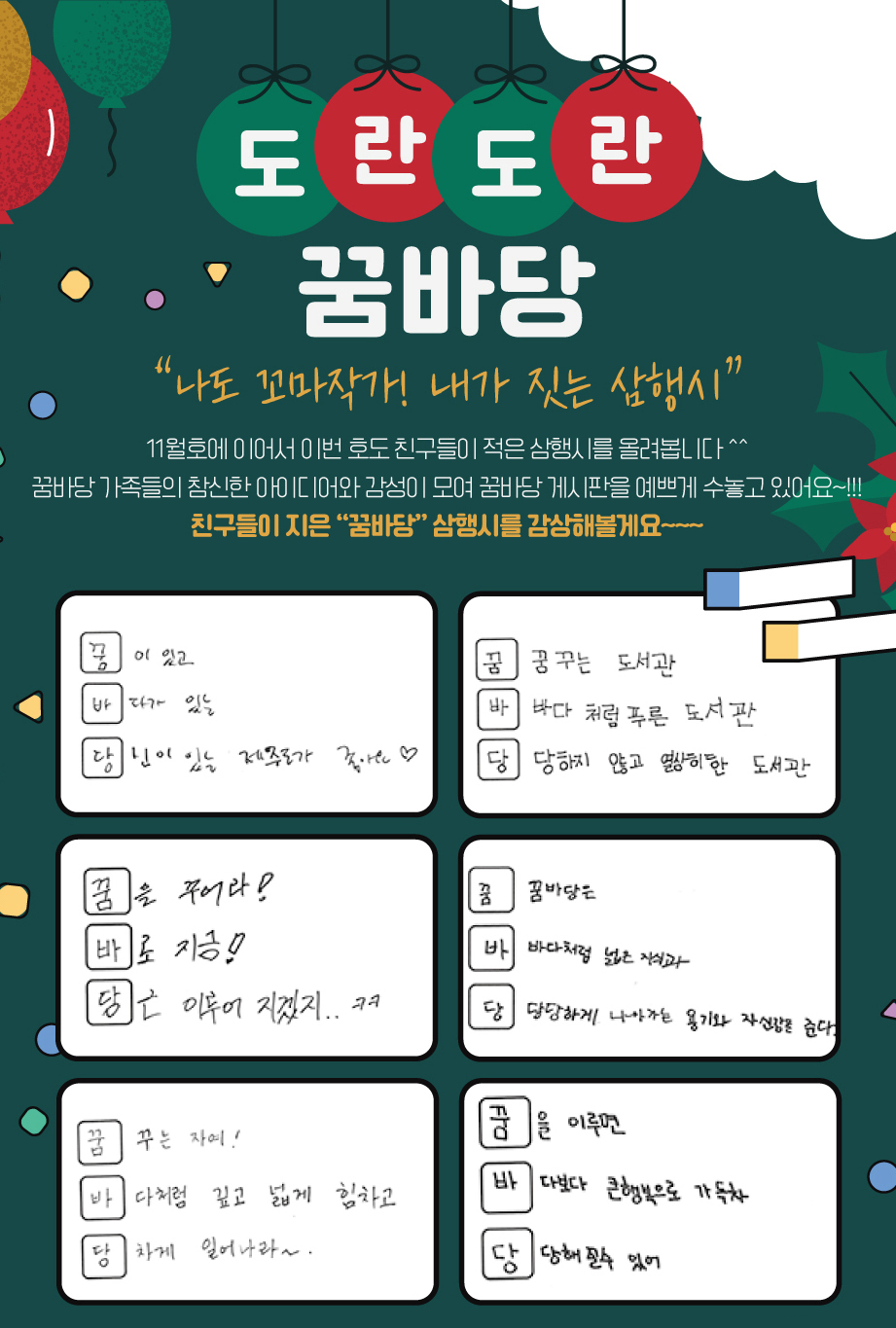 | 34 | 2023년 12월 도란도란꿈바당 0 | 제주꿈바당어린이도서관 | 2023-12-22 | 1,862 |