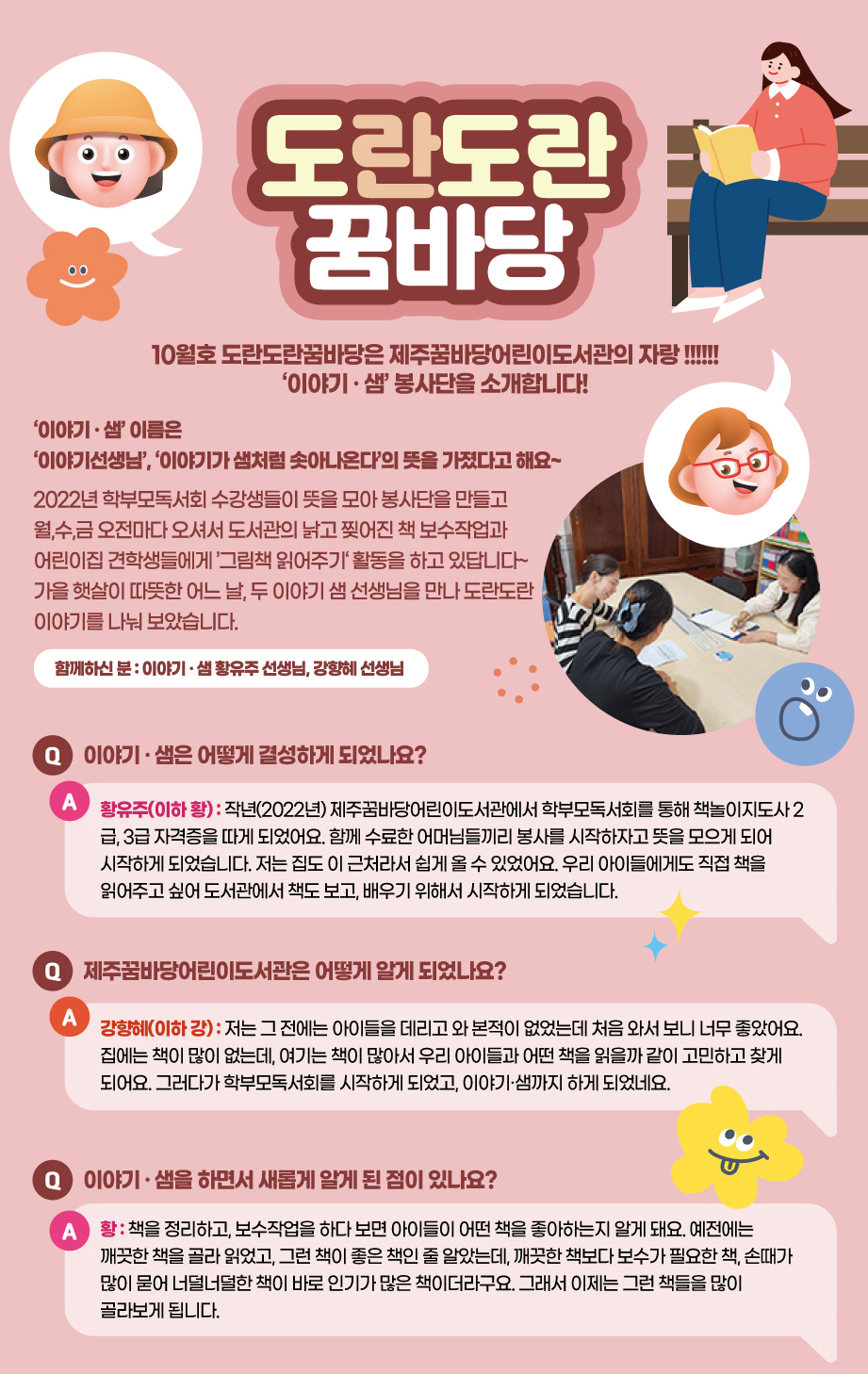 | 33 | 2023년 10월 도란도란꿈바당 0 | 제주꿈바당어린이도서관 | 2023-10-27 | 1,773 |