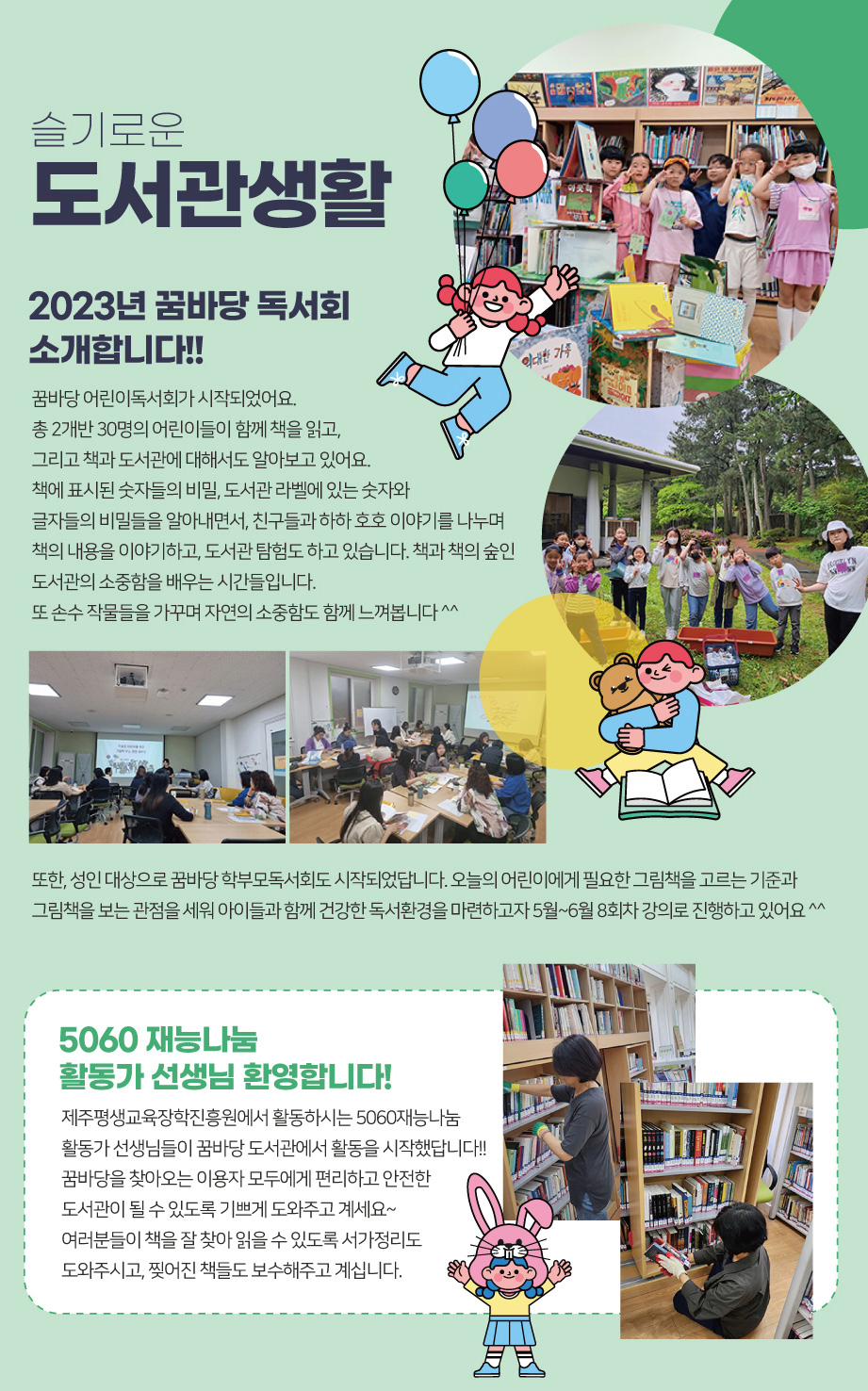 | 37 | 2023년 10월 슬기로운 도서관 생활 0 | 제주꿈바당어린이도서관 | 2023-10-27 | 1,510 |