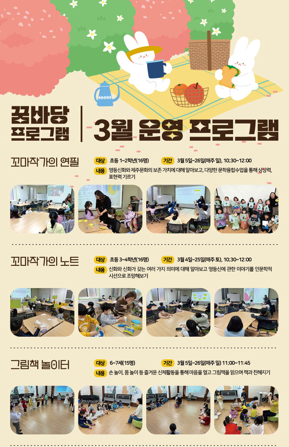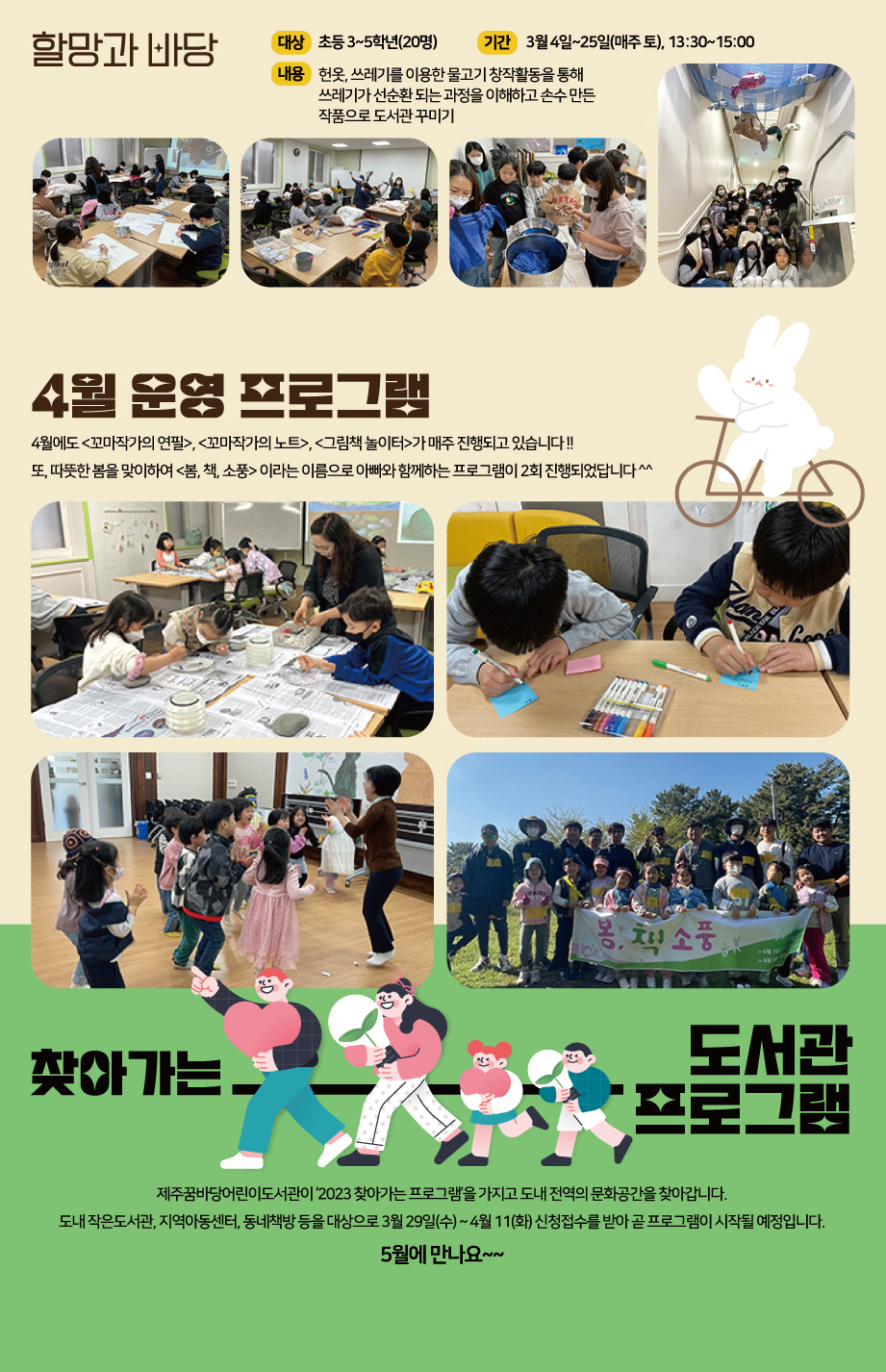 | 34 | 2023년 4월 꿈바당프로그램 0 | 제주꿈바당어린이도서관 | 2023-04-24 | 2,037 |